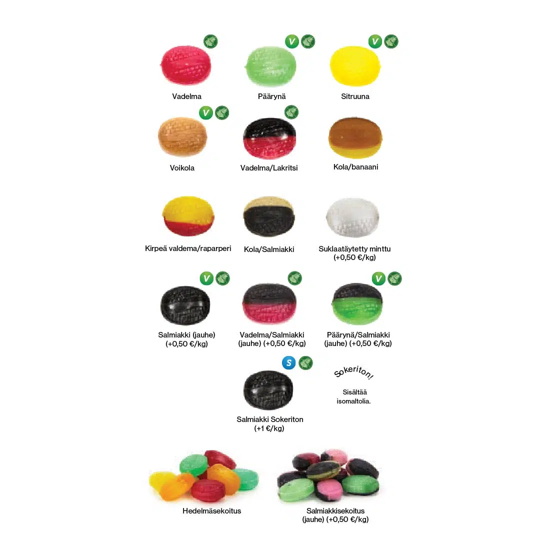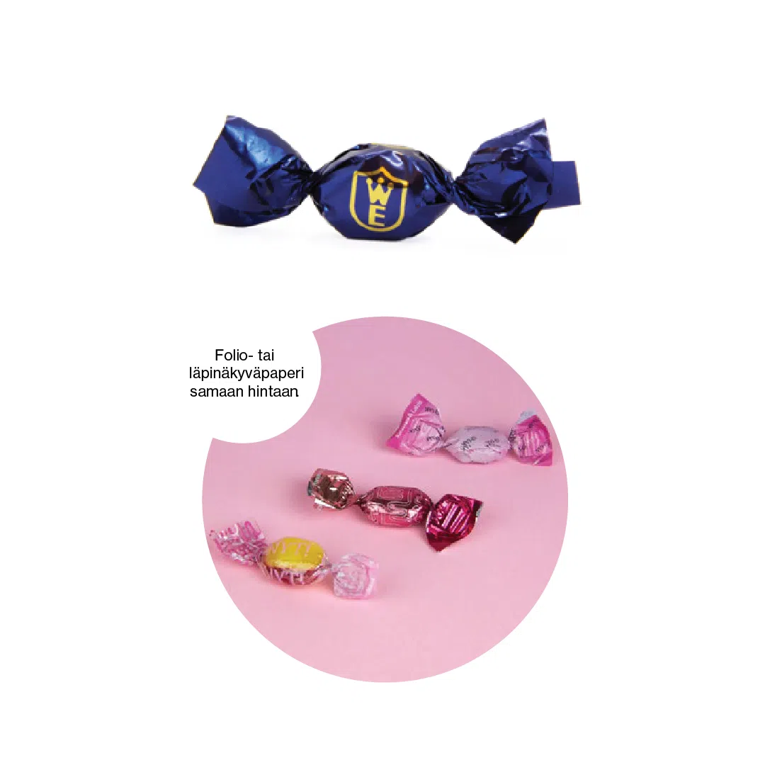 Anna brändillesi makua! Ruotsissa valmistetut, kovat mainoskaramellimme ovat korkealaatuisia ja niissä on terävä painatus. 200 karamellilla kiloa kohti se on uskomattoman kustannustehokas tapa tavoittaa uusia kontakteja messuilla tai myymälässä. Sekoita suosikkimakujasi ja tarjoa makea kokemus, jota asiakas ei unohda!