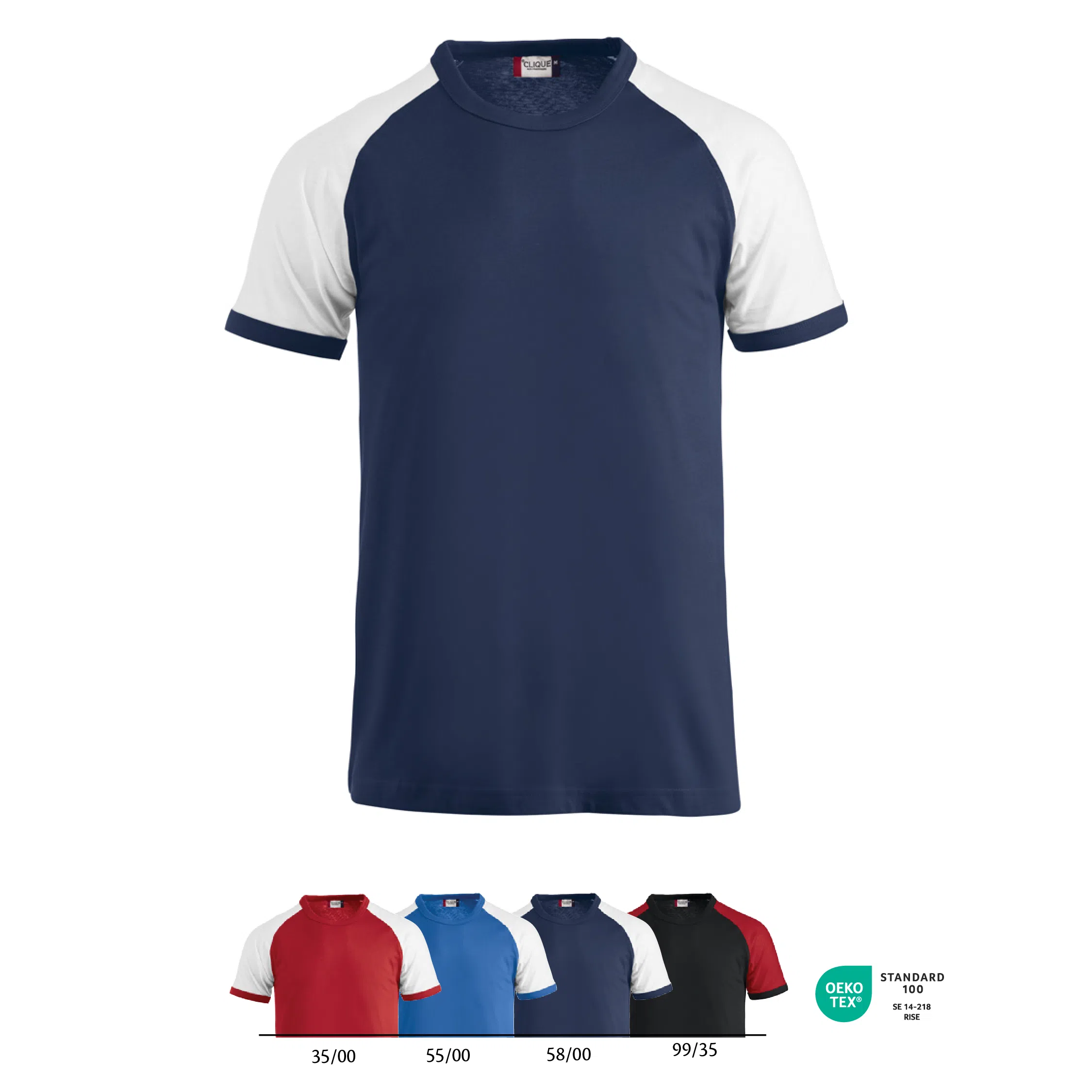 Kaksivärinen raglan T-paita, jossa kontrastiväriset hihat.