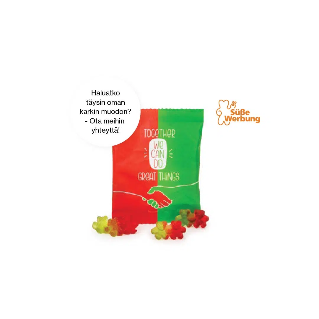 Täydellinen pieni give-away! Tämä kätevä karkkipussi on täynnä ihanaa hedelmäsekoitusta hyviä hyytelönalleja. Suunnittelullasi se on edullinen ja tehokas tapa levittää iloa ja brändiäsi. Saatavilla myös kompostoitavassa pussissa kestävämpää vaihtoehtoa varten.
