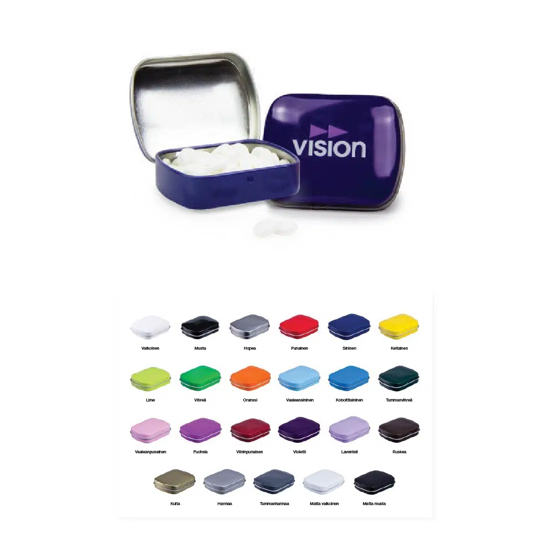 Tyylikäs ja uudelleenkäytettävä klassikko! Painata logosi tähän eleganttiin mintturasiaan, valitse suosikkivärisi ja täytä se raikkailla minttutableteilla. Se on ylellinen ja arvostettu tapa markkinoida itseään. Kun minttutabletit ovat loppu, tyylikäs rasia jää ja jatkaa brändisi esittelyä.