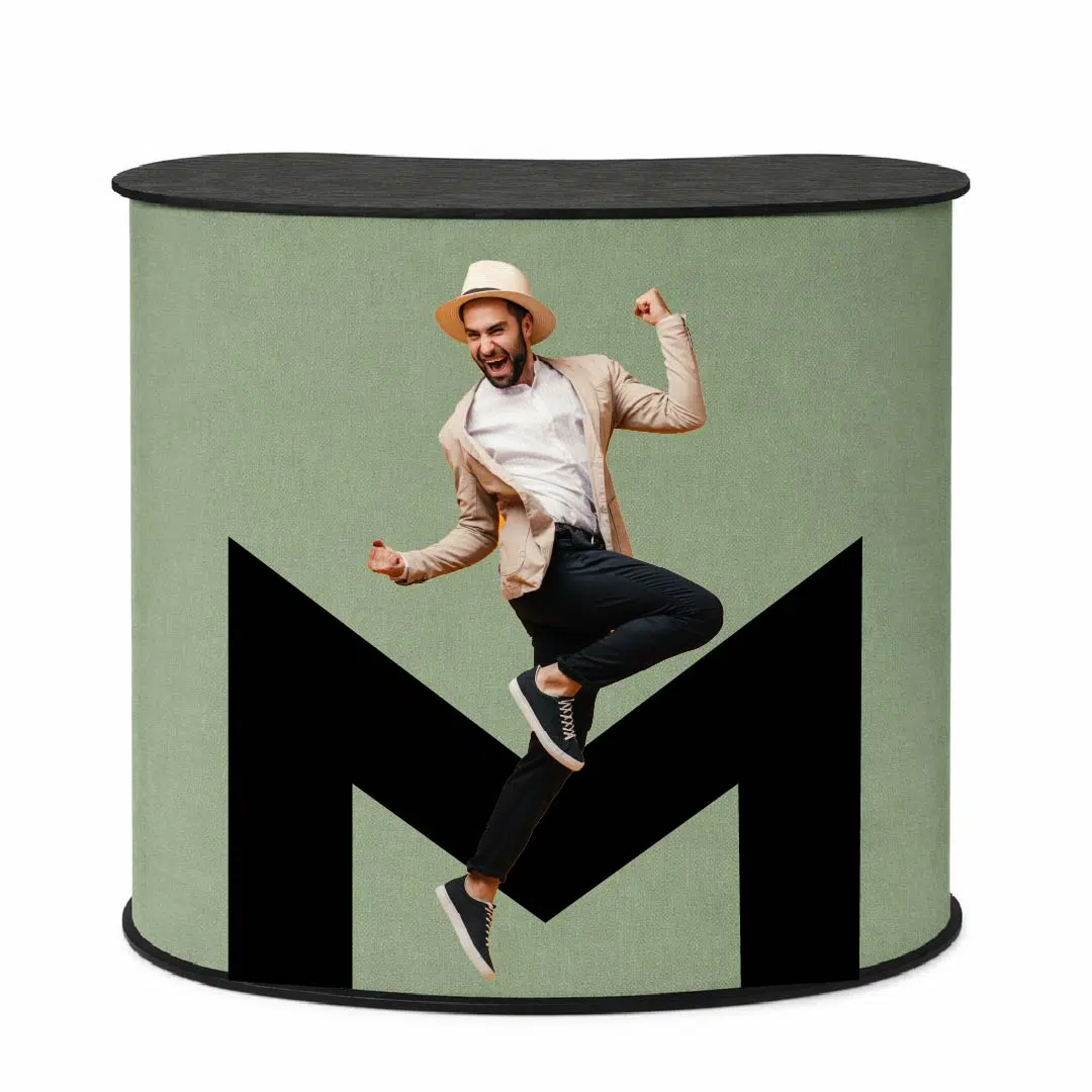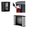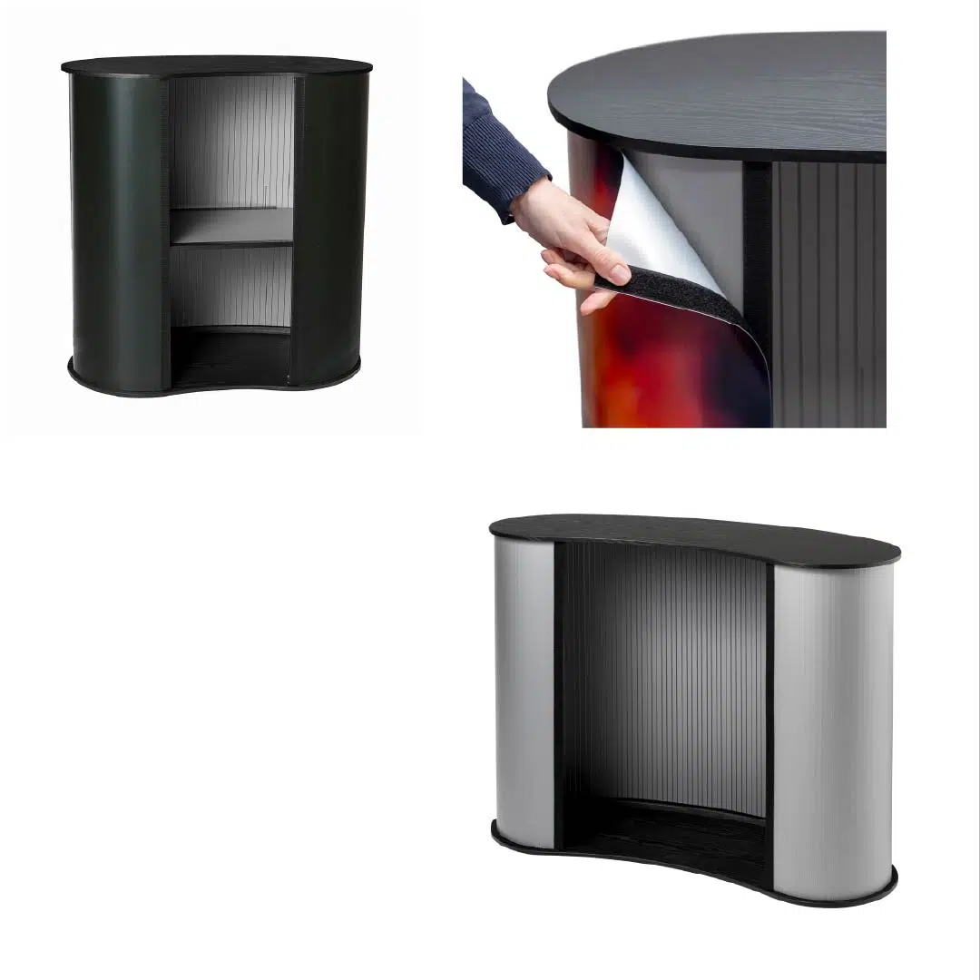 Tee tapahtumastasi helpompi! Messupöytä Expo L on helposti kuljetettava ja nopeasti koottava messutiski, joka sopii erinomaisesti messuille ja tapahtumiin. Tyylikäs, kaareva musta pöytätaso yhdistettynä kanavarakenteiseen etupaneeliin ja tarrakiinnitysjärjestelmään (Velcro) takaa siistin ja saumattoman grafiikan kiinnityksen.