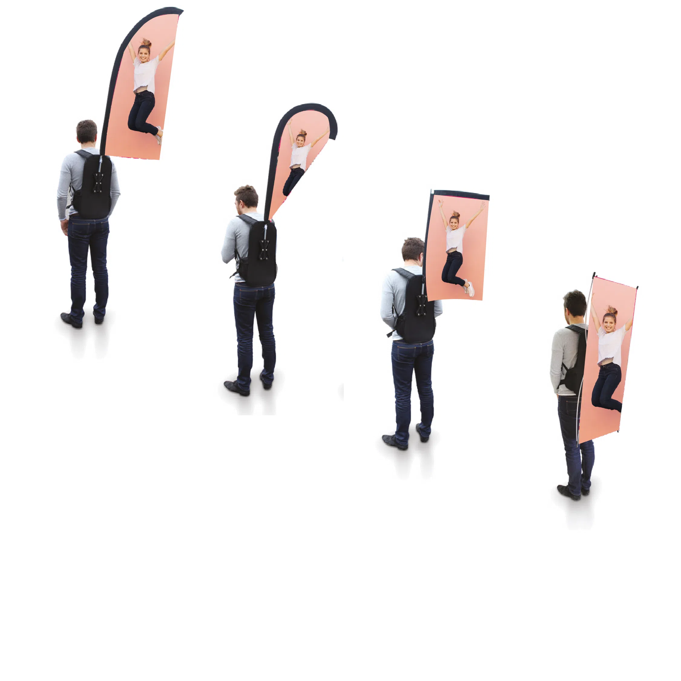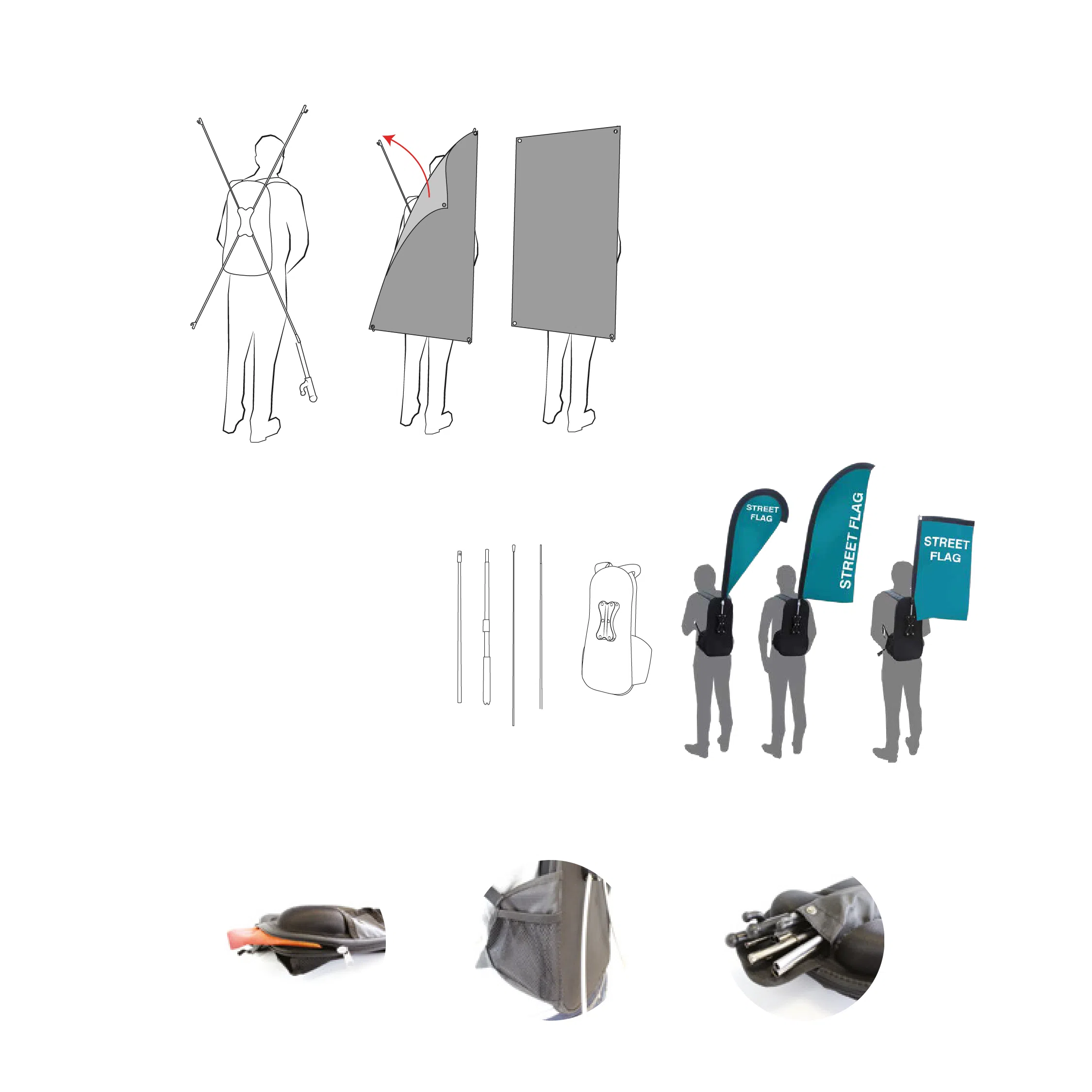 Kestävä ja kevyt reppumallinen teline on valmistettu vahvistetusta nailonista, ja se toimitetaan valmiina kuitutankojen kanssa. Reppu on yhteensopiva neljän eri lipun muodon kanssa, joten voit valita käyttötarkoitukseen parhaiten sopivan vaihtoehdon.