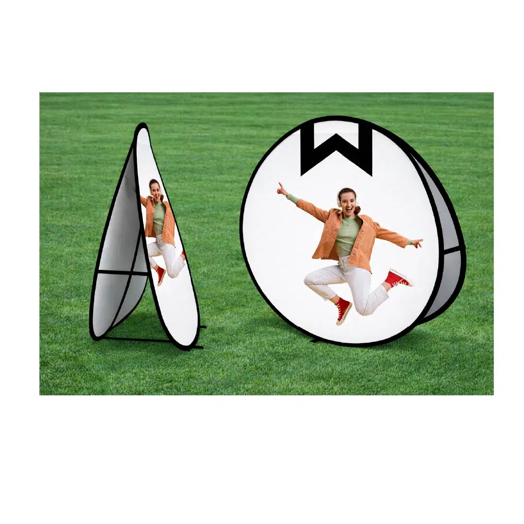 Pyöreä Sandwich banneri on näyttävä ja edullinen sisä- ja ulkokäyttöön soveltuva kangasbanneri, joka erottuu keveydellään ja erittäin nopealla kasauksella ja kokoon taittamisella. Suuret kangasbannerit ovat kirkasvärisiä ja kaksipuoleisia, ja niiden värit ovat UV-suojattuja. Suuri koko ja kaksipuolinen tulostus mahdollistaa niiden käyttämisen myös tilanjakajina. Mukana tuleva kantolaukku ja kiinnikkeet mahdollistavat bannerin nopean ja helpon siirtämisen tapahtumasta toiseen.