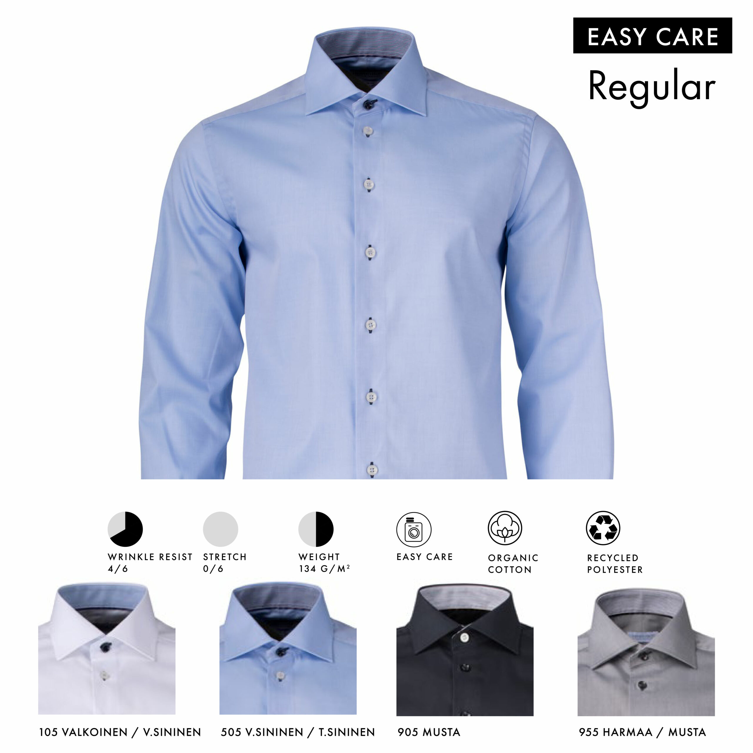 Ympäristöystävällinen ja helppohoitoinen käsittely. Uniikki viimeistely, joka antaa kankaalle korkean rypyttömän luokituksen ja ylellisen ja pehmeän tuntuman. Kuivuu nopeasti. Jaettu selkäkaarroke varmistaa paidan istuvuuden harteista ja antaa liikkumavaraa.